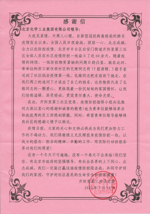 近日,北化集團辦公室接到一封來自豐臺區右安門街道開陽里第三社區黨委寄來的感謝信,對集團信息化部干部孔維無償向社區捐贈防疫物資表示衷心感謝。