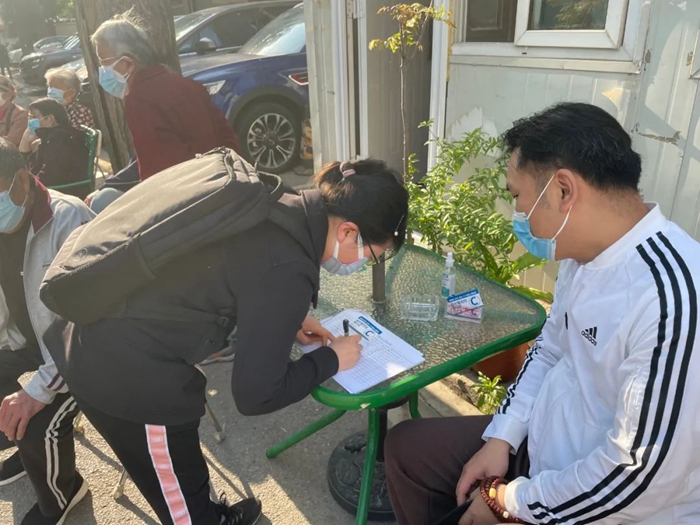共產黨員楊帆在潘家園街道潘家園東里社區參加核酸檢測現場秩序維護或信息錄入工作。