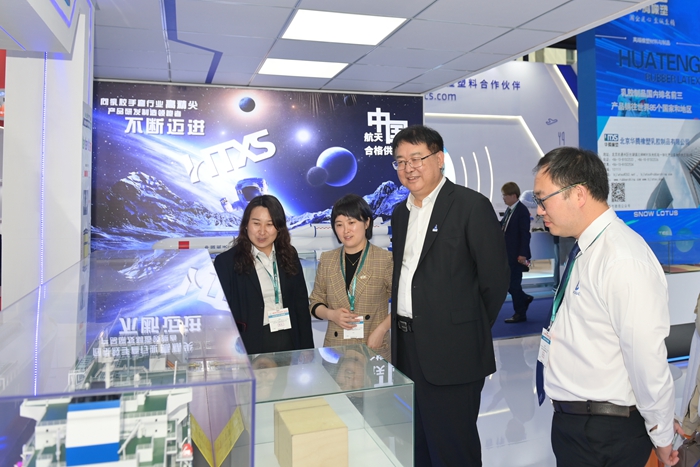 展會期間,北京化工集團黨委副書記、董事、總經理楊旭輝,副總經理張榮寰,總會計師金黎明也來到集團展臺參觀指導。楊旭輝一行聽取了現場各企業的詳細介紹,深入了解現場展示的儲氫瓶內膽材料、LNG船用膠、航天手套等高精尖產品,親切慰問現場工作人員。