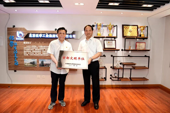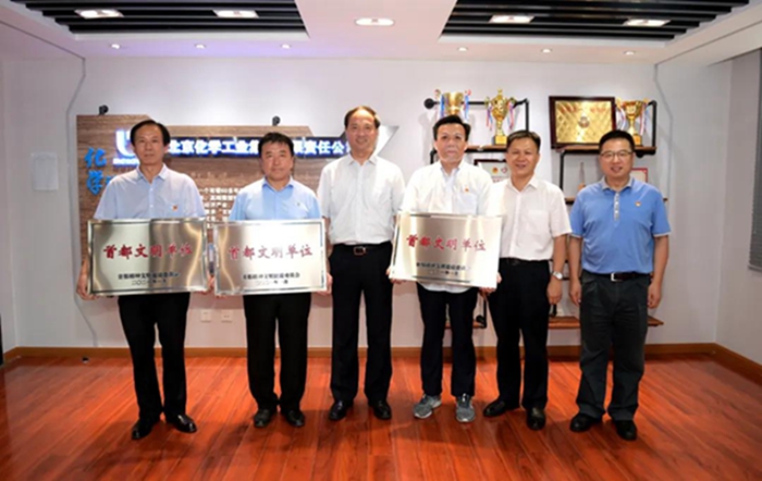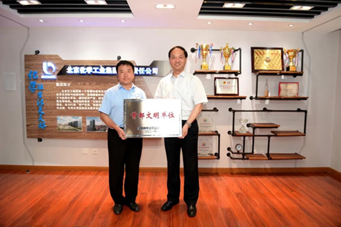 9月1日,北京化工集團黨委書記、董事長王國華向獲首都文明單位稱號的3個單位授牌,黨委副書記吳瑞峰,總經理助理、華騰拓展公司黨總支書記李泳,化研院黨總支書記楊傳忠,華騰天海公司黨總支書記崔志宏參加授牌儀式。